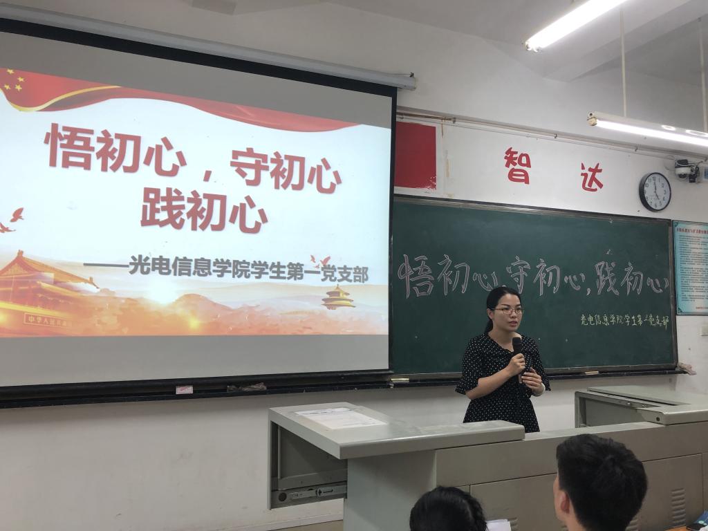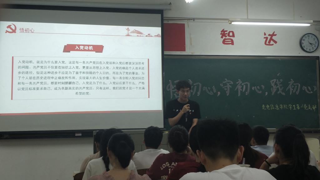 活动主要分为三个部分,分别是党课学习、心得交流和重温入党誓词。党课上,学生党员申官同志以“不忘初心,牢记使命,立足本职,矢志奋斗”为主题结合自己个人入党过程及成长经历从悟初心,守初心,践初心三个方面展开讲解,讲解深入浅出,娓娓道来。在谈到初心,他说道,中国共产党人的初心和使命是为中国人民谋幸福,为中华民族谋复兴。作为一名毕业生,即将走出校园,走入职场,在未来的工作岗位上我们要牢记共产党人的初心和使命,立足本职,矢志奋斗,为社会的发展进步贡献力量。