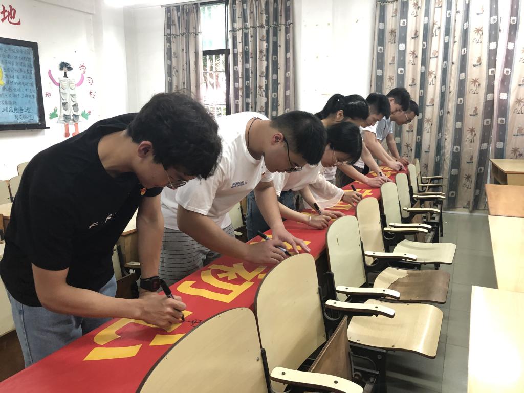 最后,全体毕业生党员重温入党誓词。大家面向党旗,举起右拳,重温入党宣誓,大家字正腔圆,声音铿锵有力,场面庄重严肃。宣誓完毕,支部全体成员在“悟初心,守初心,践初心”横幅上签字。