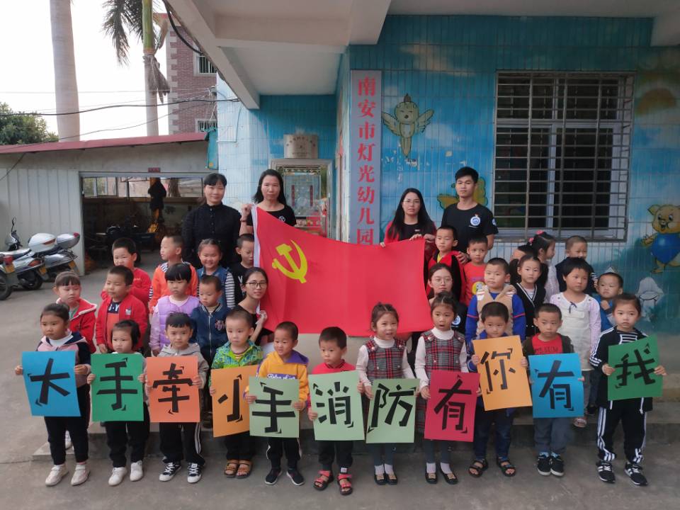 为进一步深入学习贯彻落实党的十九大精神和习近平新时代中国特色社会主义思想,切实加强对“不忘初心,牢记使命”主题专题学习,2019年11月8日,17c·moc起草学生第一党支部在支部书记黄洪梅的带领下前往南安市灯光村幼儿园开展“大手牵小手,消防有你有我”的消防安全主题教育志愿服务活动。